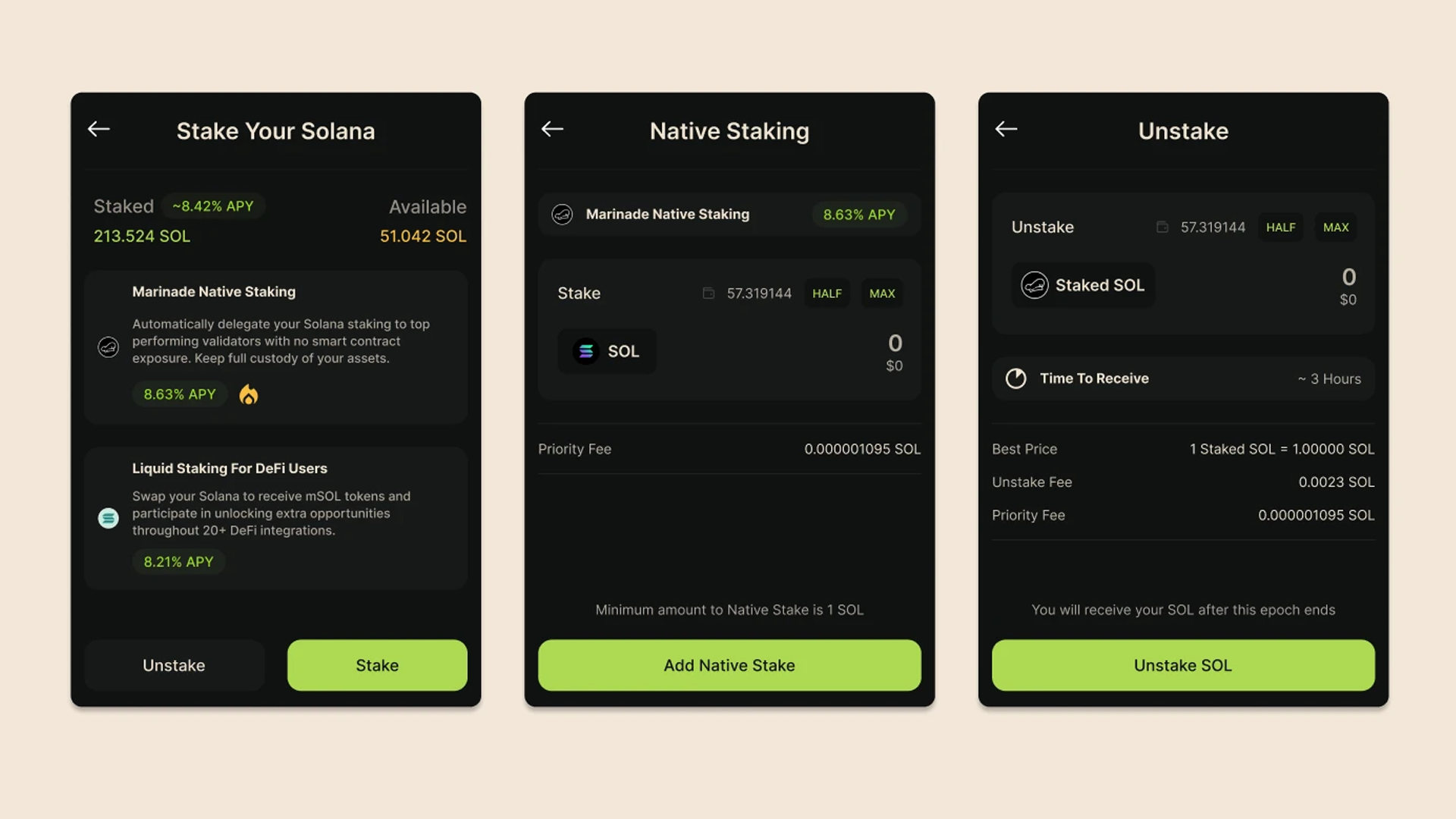 Native staking support through Marinade Finance