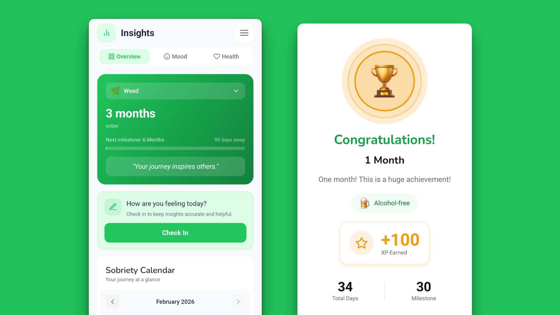 Personal sobriety tracking with milestone celebrations, badges, and progress visualizations