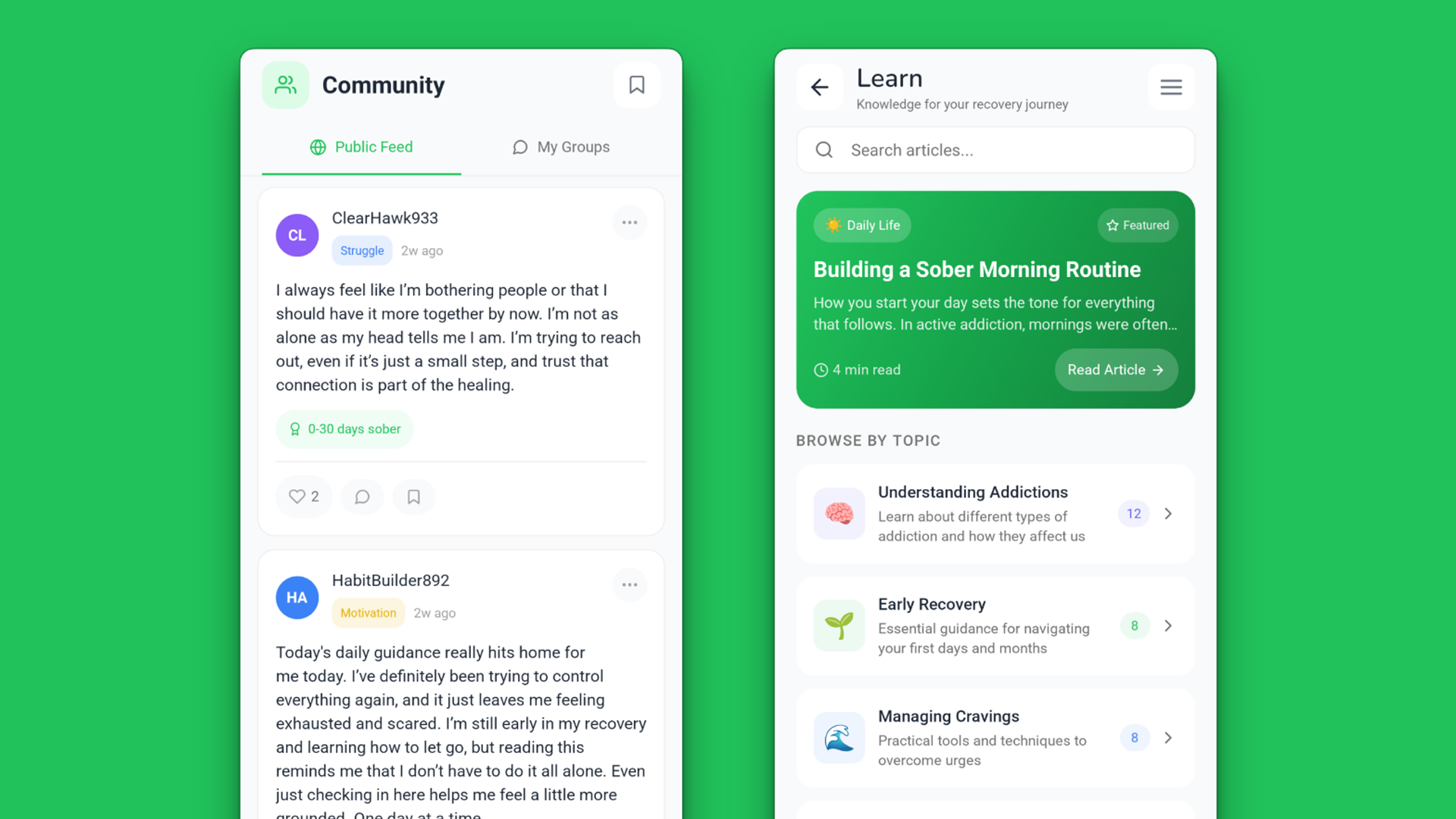 Centered the product around community connection rather than solo tracking — peer support is the strongest predictor of long-term recovery